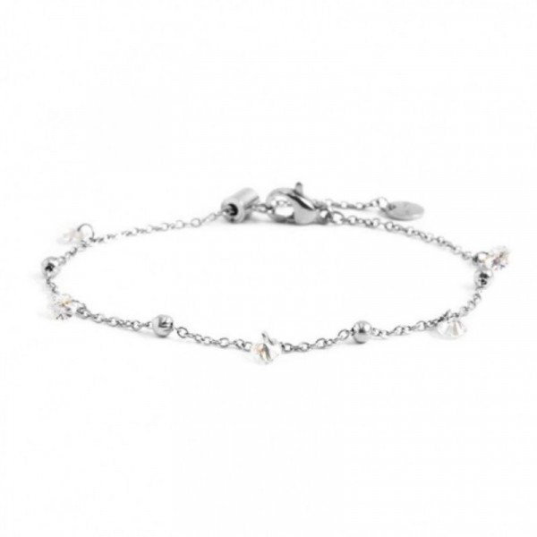Bracciale in acciaio con catena market ball, con cristalli bianchi e sfere di acciaio alternati. Lunghezza totale 19 cm regolabile da 19 cm a 15 cm tramite cursore cilindrico con anello con silicone. Marlù logo tag presente all'estremità. Collezione