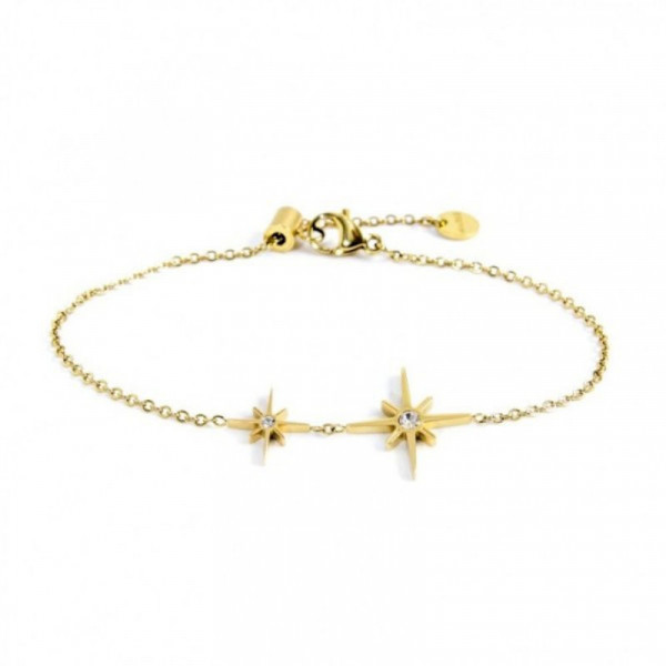 Bracciale in acciaio con pvd oro con catena cross e con doppio pendente a forma di rosa dei venti: il primo pendente più grande presenta cristallo bianco al centro, sul lato posteriore ha inciso al centro il simbolo della rosa dei venti e sulle punte