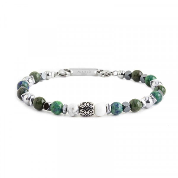 Bracciale con al centro elemento con texture in black oil, alternate sfere di agata bianca, di lapis afgano, sfere di acciaio lucido, elementi di ematite lucida e scura. Lunghezza totale 21 cm, regolabile da 21 cm a 19,2 cm tramite logo tag Marlù removibile in acciaio.