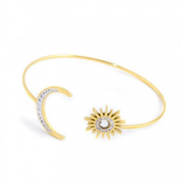 Bracciale rigido in acciaio con pvd oro con sole e con luna con cristalli bianchi, il logo Marlù è inciso sul retro del sole, sul retro della luna è presente una texture incisa. Bracciale regolabile con asse maggiore 5,6 cm. Collezione: Vision 03 M