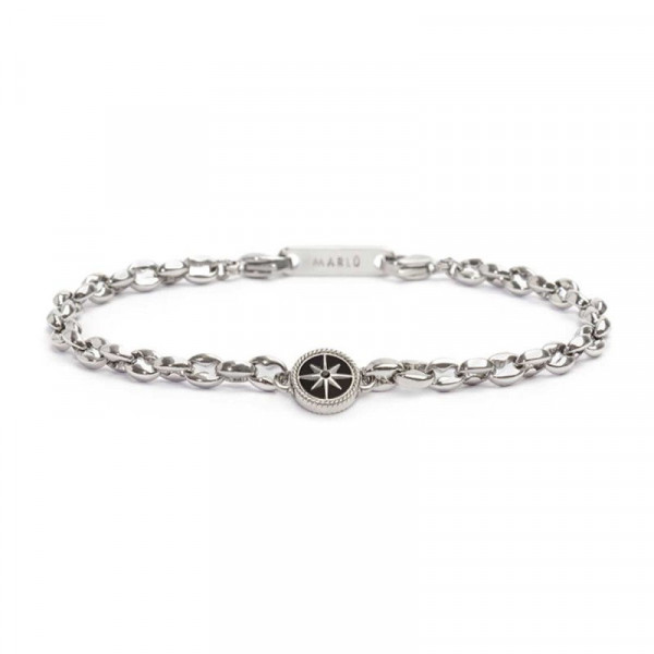 Bracciale in acciaio con catena marine con centrale tondo con rosa dei venti con black oil e al centro un cristallo nero. Lunghezza totale 21 cm, regolabile da 21 a 19 cm tramite logo tag Marlù in acciaio removibile. Materiali: acciaio, black oil, cristallo