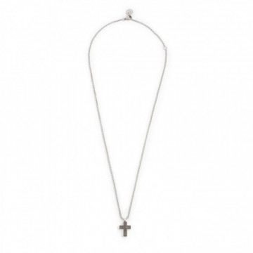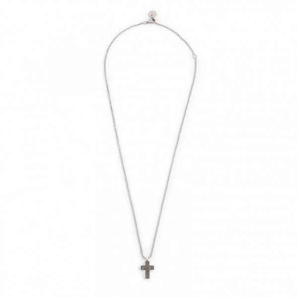 Collana in acciaio con catena box, con croce pendente con superfice frontale in canna di fucile e cristalli neri e sul retro incisione a trama. Lunghezza totale 50 cm, regolabile da 50 a 45 cm. Marlù logo tag presente all'estremità. Materiali: acciaio, cristalli Collezione: MAN06