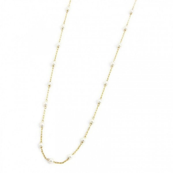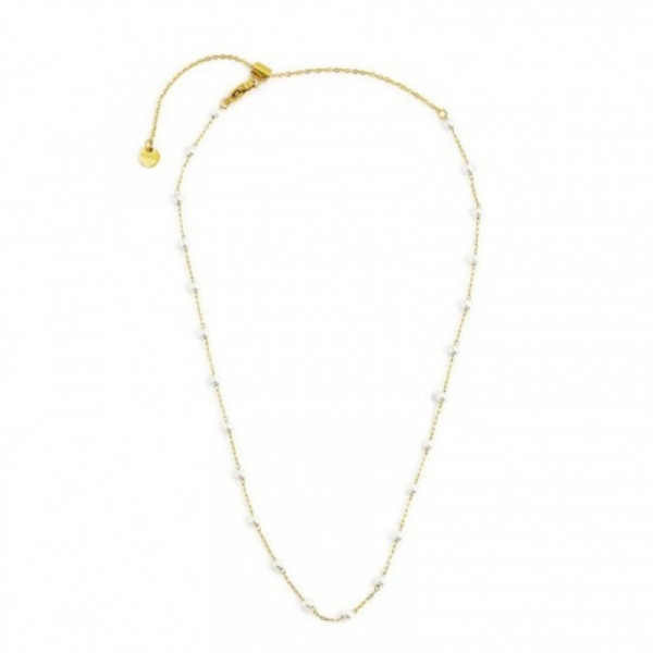 Collana in acciaio con oro pvd con catena con perle con diametro 3.30 mm. Lunghezza totale 44 cm regolabile da 44 cm a 34 cm tramite cursore. Marlù logo tag presente all' estremità. Collezione: BEW06 Materiali: acciaio con pvd oro, perle