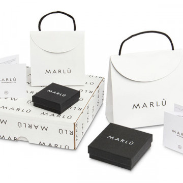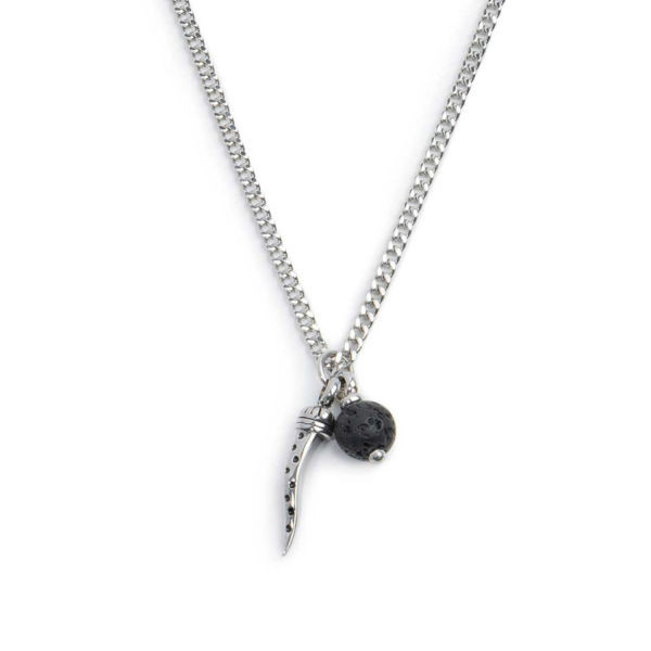 Collana in acciaio con catena a grumetta, con corno in acciaio con trama con black oil e sfera in pietra lavica pendenti. Ad una estremità tag in acciaio inciso con black oil opaco, su un lato il logo Marlù e sull' altro lato la frase "BORN FROM FIRE". Lunghezza totale 70 cm, regolabile a 50 cm, a 60 cm, a 70 cm. Materiali: acciaio, pietra lavica, black oil