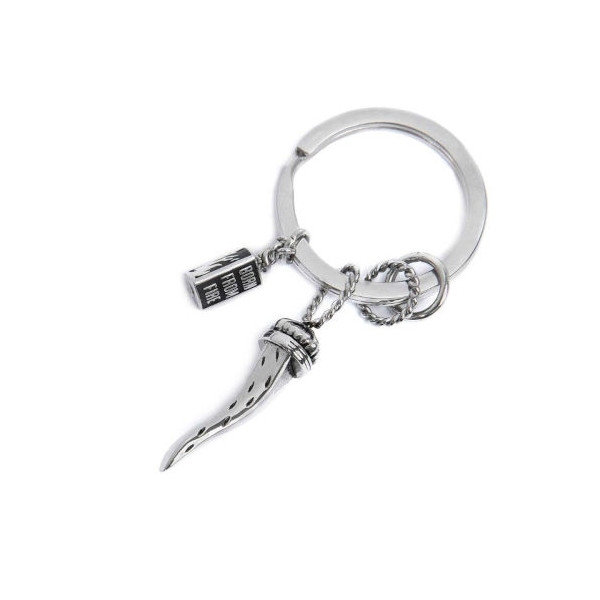 Portachiavi tondo in acciaio con diametro 30 mm con logo Marlù laserato sul fianco, contenente due anellini uno dei due con texture e due pendenti. Il primo pendente è a forma di corno in acciaio con trama con black oil opaco. Il secondo pendente con elemento triangolare in acciaio inciso con black oil: su un lato una fiamma, su un altro il logo Marlù, su un altro la frase "BORN FROM FIRE". Lunghezza totale 6,7 cm. Materiali: acciaio, black oil opaco